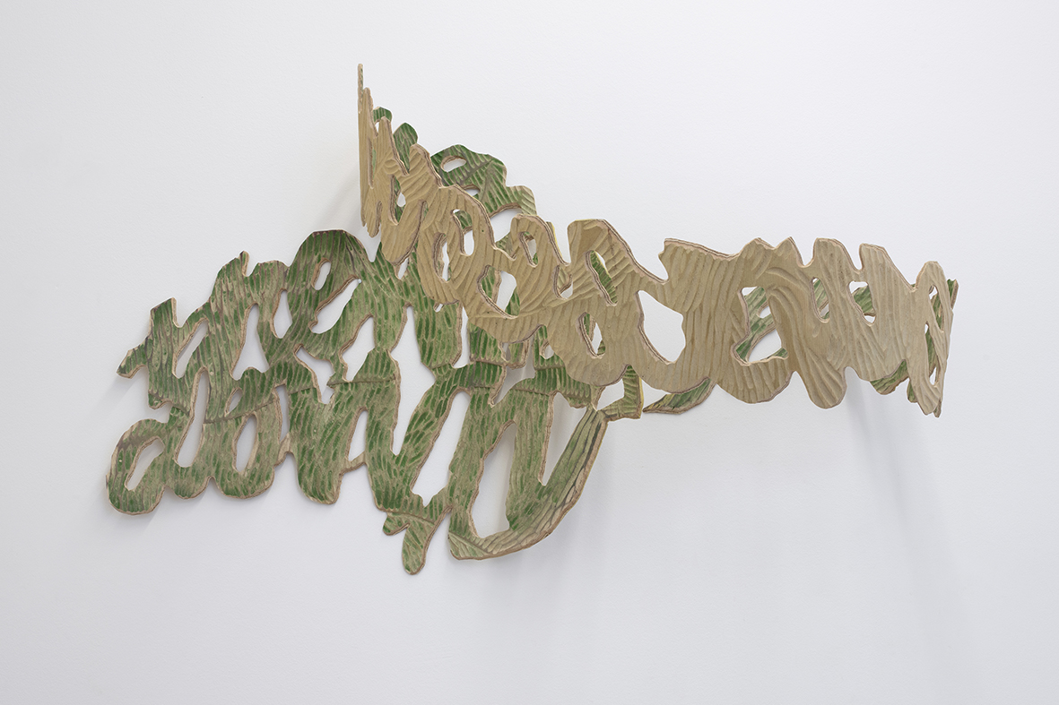 Recurring motifs include hands, mouths and forms inspired by the sphericon, a mathematically continuous object that appears to move endlessly. These forms operate as metaphors for idioms themselves—expressions that travel across cultures and time. Crafted from multiplex plywood, a material both utilitarian and poetic, the works hover between sculpture and painting, between legibility and abstraction.