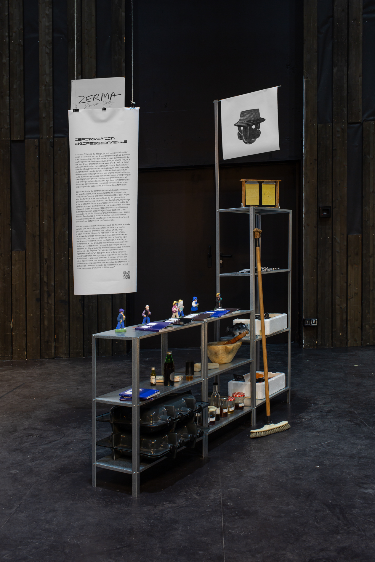 Au sein de l’Atelier Zerma, le design ne s’impose pas, il s’infiltre. Il se glisse dans les interstices, détourne les dispositifs existants, adopte des formes vernaculaires pour mieux révéler les récits tus et les économies parallèles. En s’installant là où on ne l’attend pas — dans les placards d’une école, une poissonnerie, une crèche de santons, l’atelier d’un tailleur de marbre, le sac d’un livreur à scooteur ou le local d’entretiens d’un musée— le travail de l’Atelier Zerma adopte une posture critique, habilement dissidente. D’ailleurs c’est ce que nous dit le mot zerma, de l’arabe maghrébin « Zarma, za’ma », interjection argotique signifiant « soi-disant », « genre », exprimant l’ironie, le cynisme, le doute ou le détournement. Atelier Zerma, produit le design à notre insu, dans les entrailles d’une société capitaliste où la violence de classe et du travail ne dit pas toujours son nom.