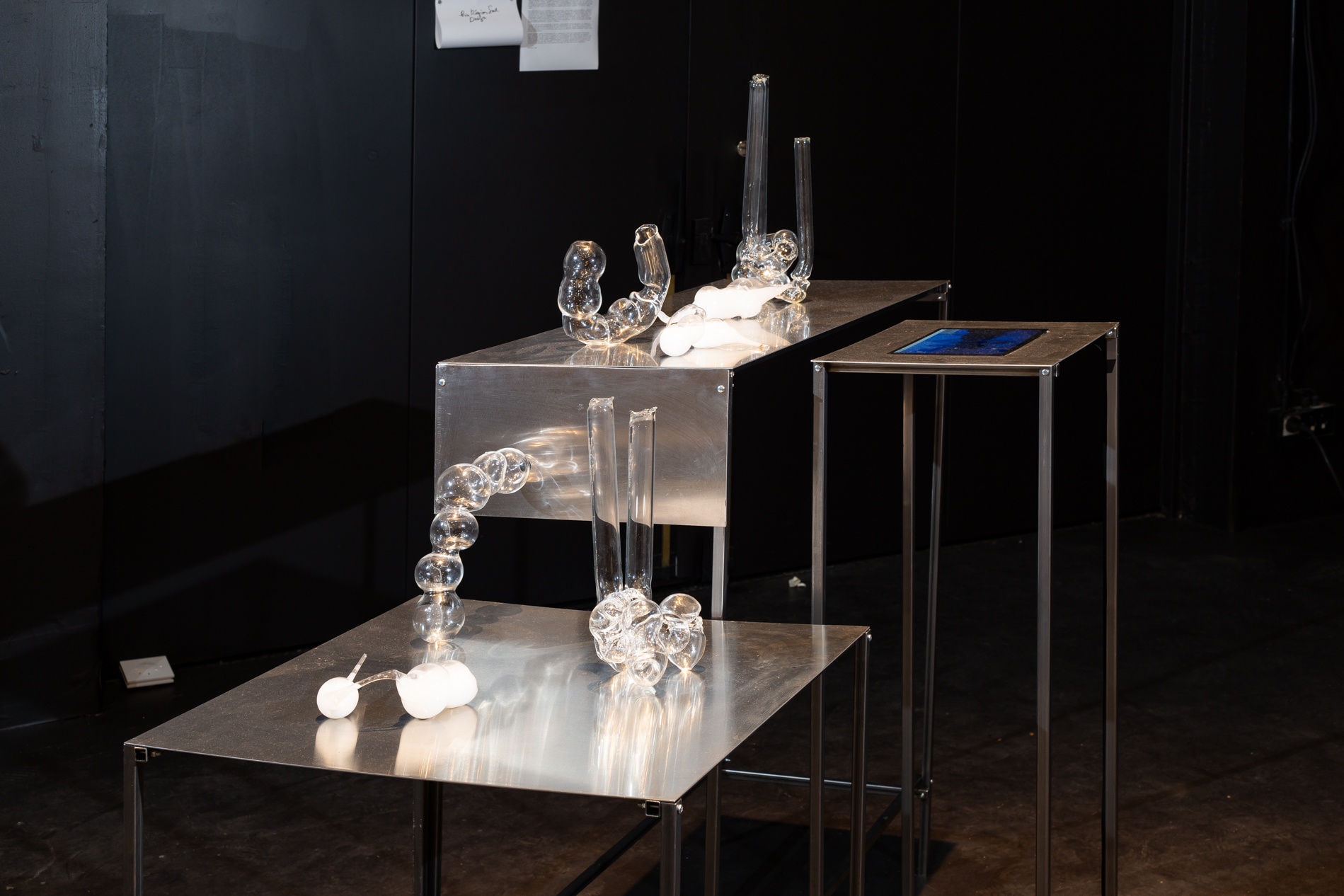 Les déformations qui naissent du verre soufflé, loin d’être des accidents, sont au contraire les signes nous invitant à une réflexion sur la matérialité et sur l’importance de l’imperfection dans la création contemporaine, imperfections que l’industrie et les outils paramétriques ont tentés d’effacer. Le verre ici devient un métamorphe, capable de reproduire la viscosité et la fluidité d’une modélisation numérique. Chaque étirement, chaque torsion du tube de verre devient une analogie du processus numérique, où les formes sont évolutives, et où la matière elle-même semble être soumise aux lois du virtuel.