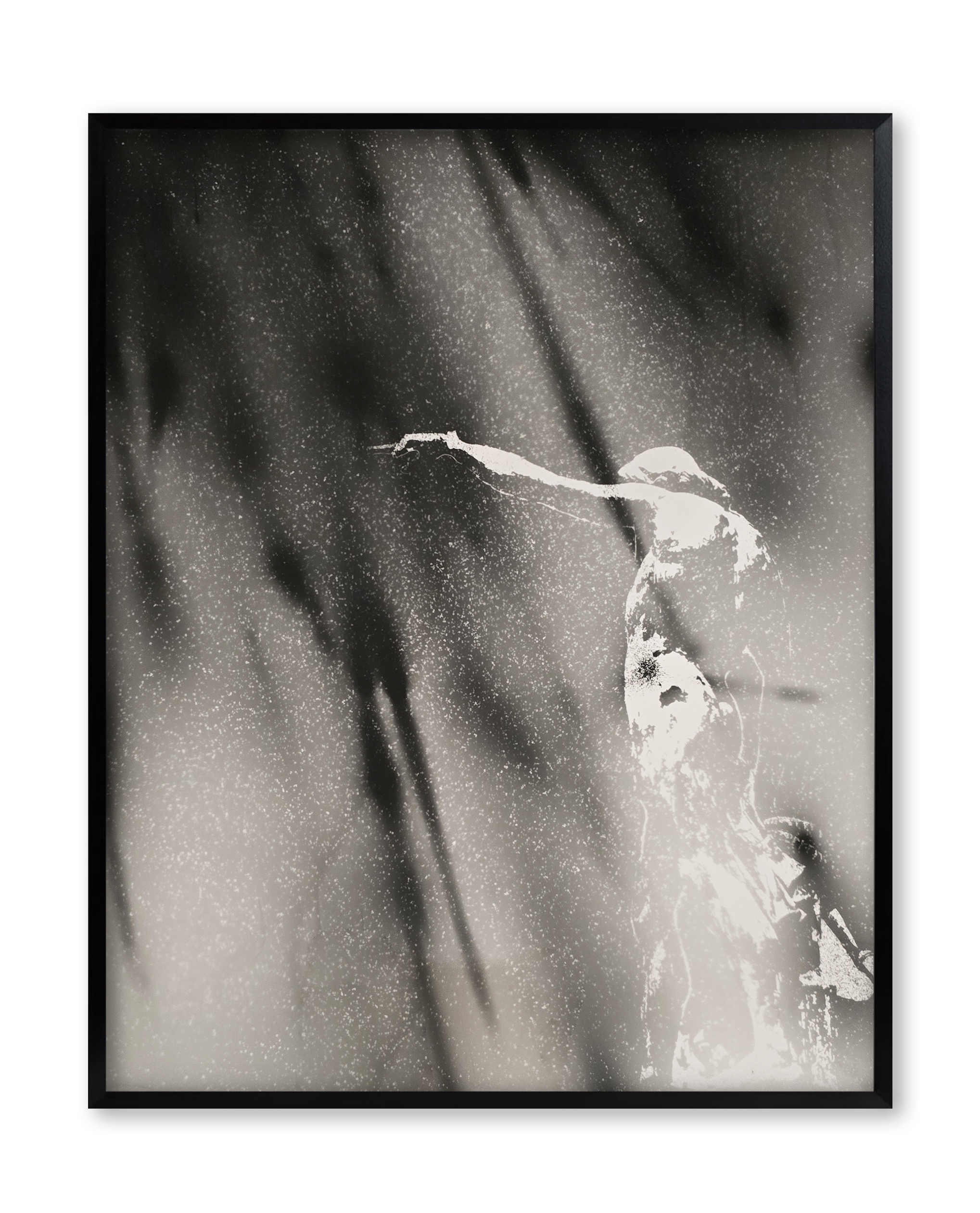Un photogramme — technique développée par l’artiste lors de sa résidence à la Villa Médicis — représente une statue du port de Toulon endommagée lors des bombardements alliés de 1944. Produite à partir d’étincelles d’acier projetées sur un papier photosensible, l’image évoque à la fois les éclats de la guerre et un ciel traversé de météores.